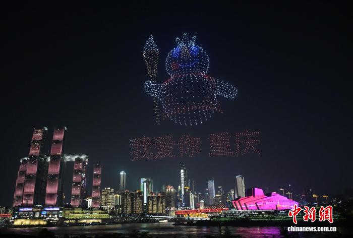 10月6日是中国传统佳节中秋节。当晚,重庆“两江四岸”上演无人机灯光秀,数千架无人机在山城夜空中勾勒出“天涯共此时”“月饼圆圆甜又香”“大展鸿‘兔’”“星语星愿”“月满人团圆”等一幅幅绚丽画面,在为市民和游客送上中秋节日祝福的同时,也献上了一场科技与艺术交融的视觉盛宴。图为无人机在空中排列出“我爱你重庆”图案。中新社记者 周毅 摄