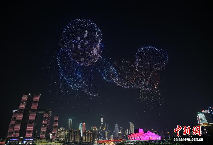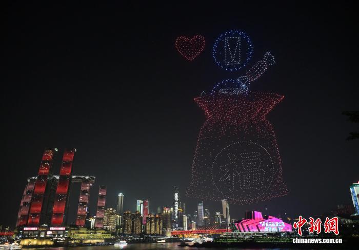 10月6日是中国传统佳节中秋节。当晚,重庆“两江四岸”上演无人机灯光秀,数千架无人机在山城夜空中勾勒出“天涯共此时”“月饼圆圆甜又香”“大展鸿‘兔’”“星语星愿”“月满人团圆”等一幅幅绚丽画面,在为市民和游客送上中秋节日祝福的同时,也献上了一场科技与艺术交融的视觉盛宴。图为无人机在空中排列出“红色福袋”图案,为大家送上满满中秋祝福。中新社记者 周毅 摄