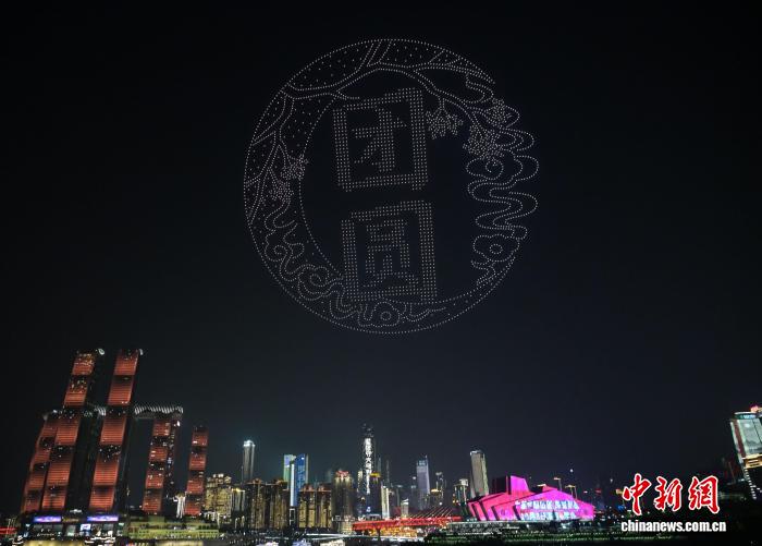 10月6日是中国传统佳节中秋节。当晚,重庆“两江四岸”上演无人机灯光秀,数千架无人机在山城夜空中勾勒出“天涯共此时”“月饼圆圆甜又香”“大展鸿‘兔’”“星语星愿”“月满人团圆”等一幅幅绚丽画面,在为市民和游客送上中秋节日祝福的同时,也献上了一场科技与艺术交融的视觉盛宴。图为无人机在空中排列出“月满人团圆”光影图案,祝愿所有人团圆美满。中新社记者 周毅 摄