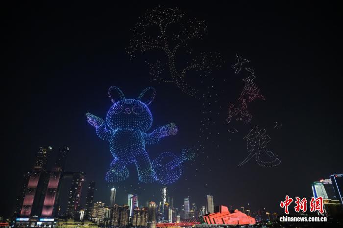 10月6日是中国传统佳节中秋节。当晚,重庆“两江四岸”上演无人机灯光秀,数千架无人机在山城夜空中勾勒出“天涯共此时”“月饼圆圆甜又香”“大展鸿‘兔’”“星语星愿”“月满人团圆”等一幅幅绚丽画面,在为市民和游客送上中秋节日祝福的同时,也献上了一场科技与艺术交融的视觉盛宴。图为无人机在空中排列出“大展鸿‘兔’”图案。中新社记者 周毅 摄